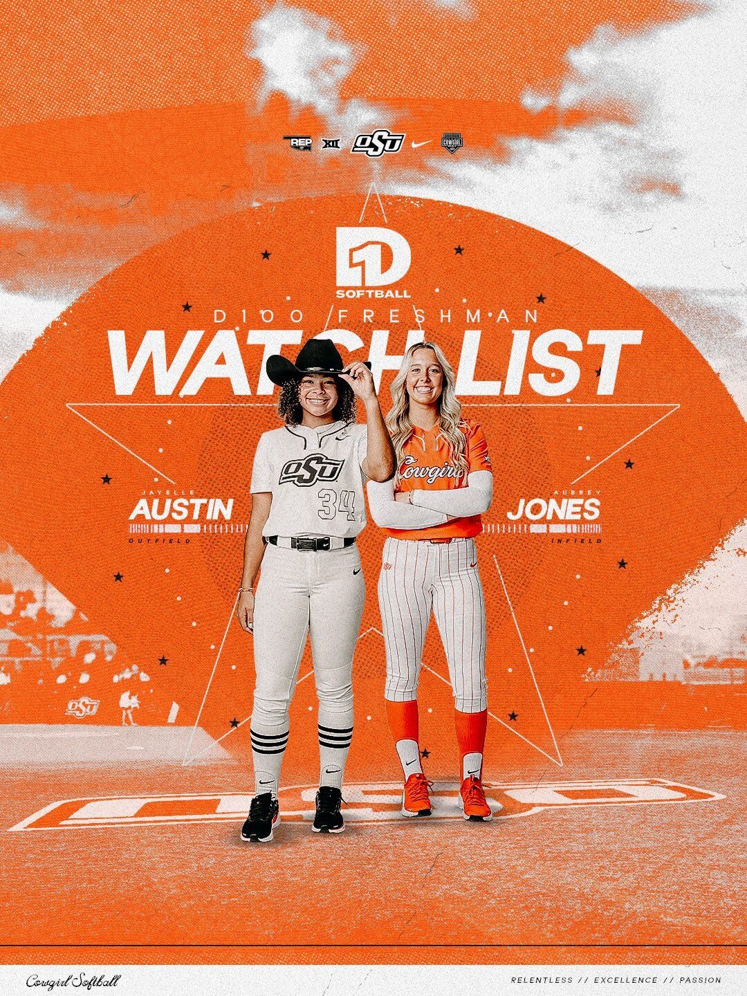 🔼 High Hopes. Two Cowgirl softball freshmen earned high preseason praise! Jayelle Austin and Aubrey Jones were named to the D1Softball D100 Freshman Watch List. Austin was rated the No. 3 outfielder in the nation by Extra Innings Softball. The Owasso native helped Owasso High School to a state championship last year as she batted .606 with 63 hits and 13 home runs. Jones was ranked as the No. 9 recruit in the nation by Extra Innings Softball. She comes to Stillwater from Gaylord, Michigan where she earned All-American honors and Michigan Player of the Year honors.