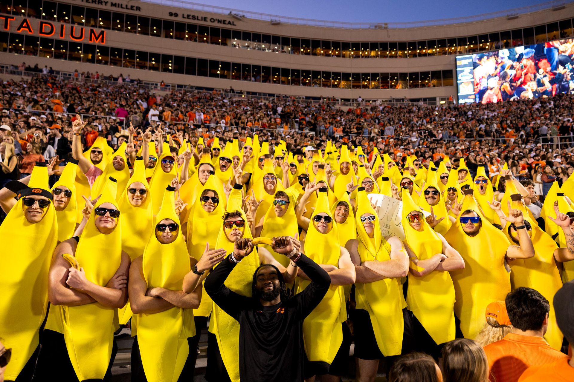 🔼 Going Bananas. Cowboy football fell to No. 24 Cincinnati 49-17 in Saturday’s Homecoming game. Rodney Fields Jr. ran for a career-high 163 yards and caught three passes for 27 yards. The fans did not disappoint, this time adding a section of bananas to Boone Pickens Stadium.