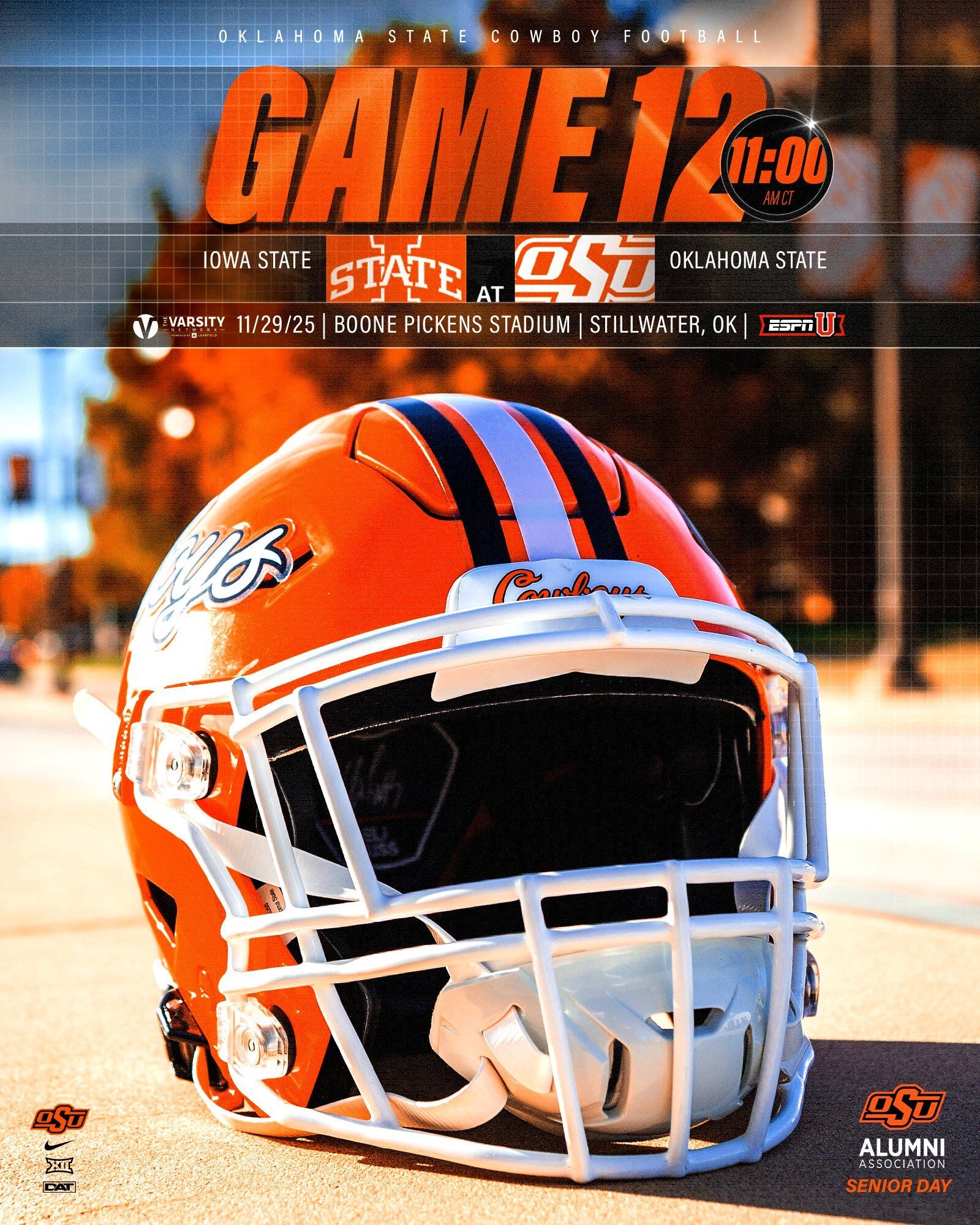 🔼 Season Finale. Oklahoma State’s football season comes to a close this weekend. They’ll host Iowa State tomorrow at 11 a.m. on ESPNU. It’s Senior Day, and the Cowboys will honor 20 seniors before kickoff.