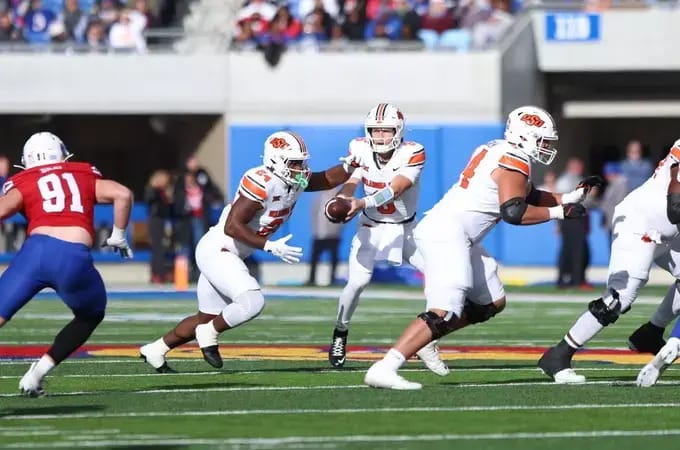 🔼 Fell Short. Cowboy football fell at Kansas 38-21 on Saturday. Zane Flores returned at the quarterback position, throwing for 235 yards and two touchdowns. Gavin Freeman and Shamar Rigby caught touchdown passes, while Sesi Vailahi rushed for one.