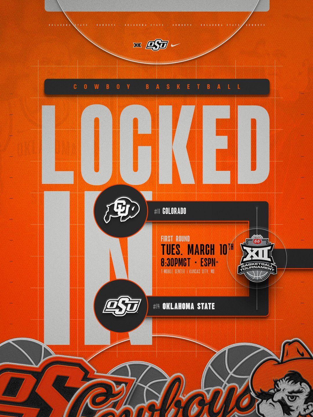 🔼 Stage Is Set. Oklahoma State men’s basketball begins Big 12 Tournament play today! The 14-seed Cowboys will play 11-seed Colorado tonight at 8:30 p.m. on ESPN+. The Cowboys are looking to avenge a loss in Boulder last month.