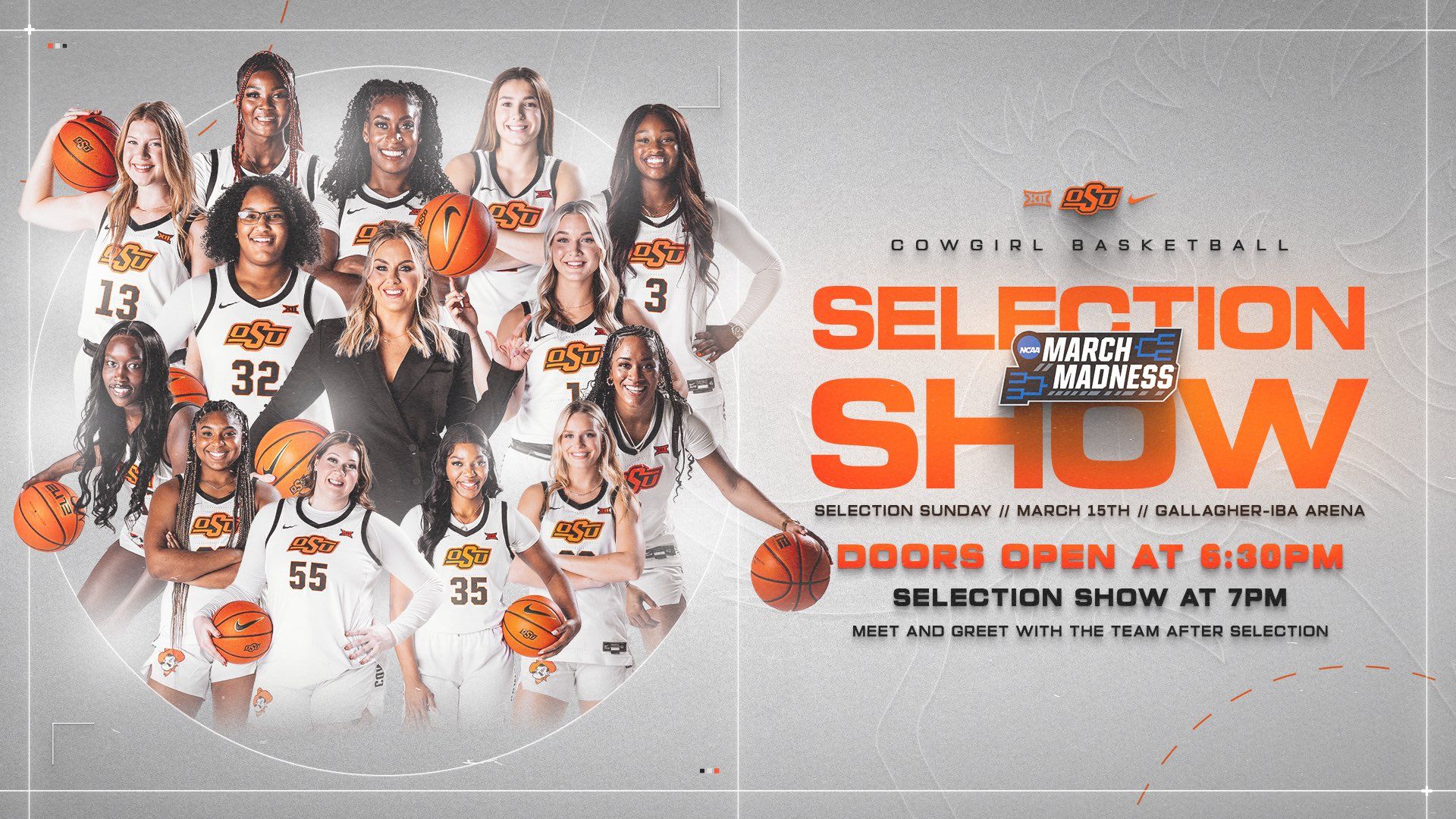 🔼 Watch Party. Join Cowgirl basketball in GIA this Sunday! Watch the NCAA Selection Show and meet the Cowgirls afterwards. Doors open at 6:30 p.m. and the show begins at 7 p.m.
