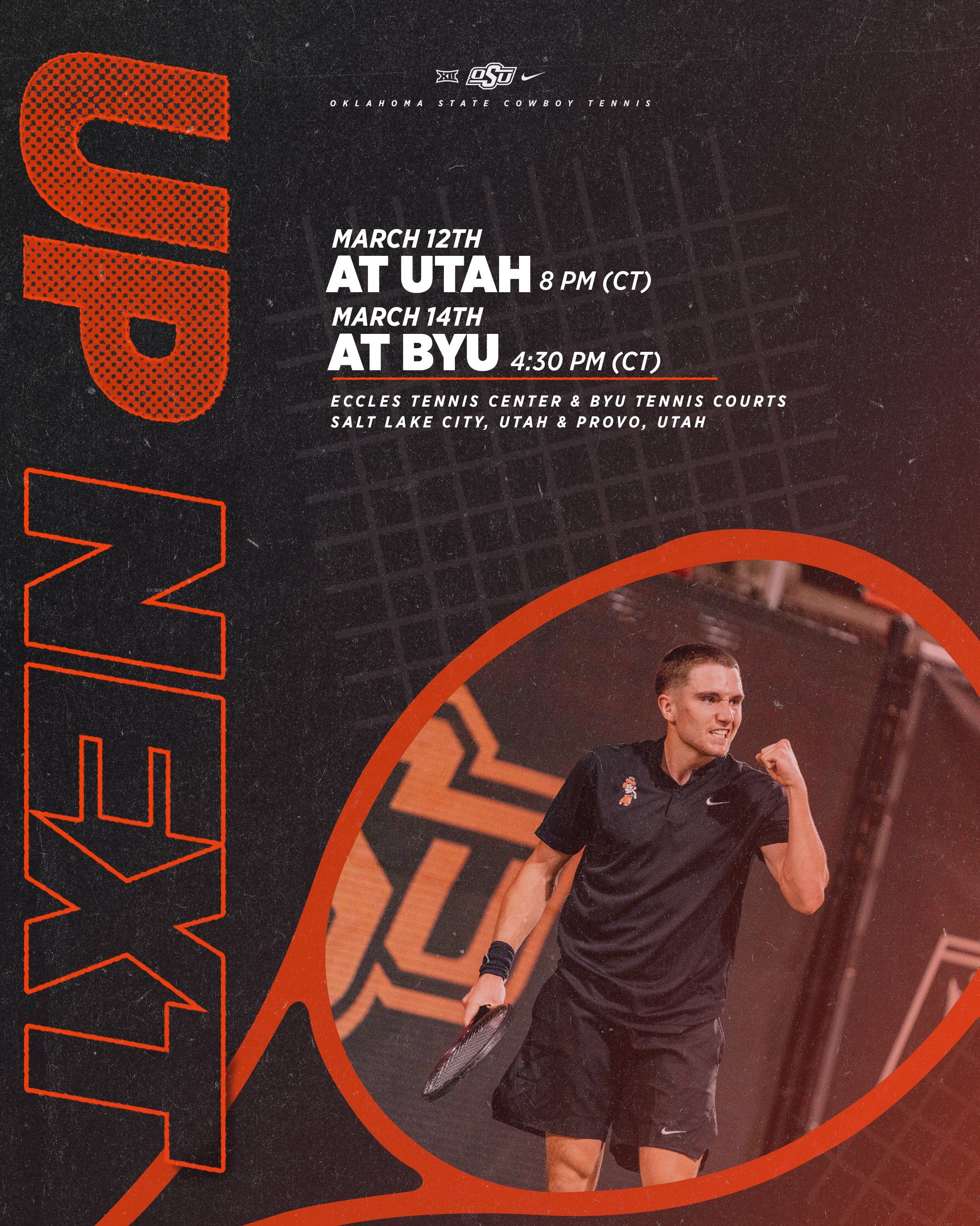🔼 Out West. Cowboy tennis is headed to Utah for the rest of the week! The Cowboys will begin Big 12 play at Utah tonight at 8 p.m. The Utah road trip continues when they play at BYU on Saturday at 4:30 p.m.