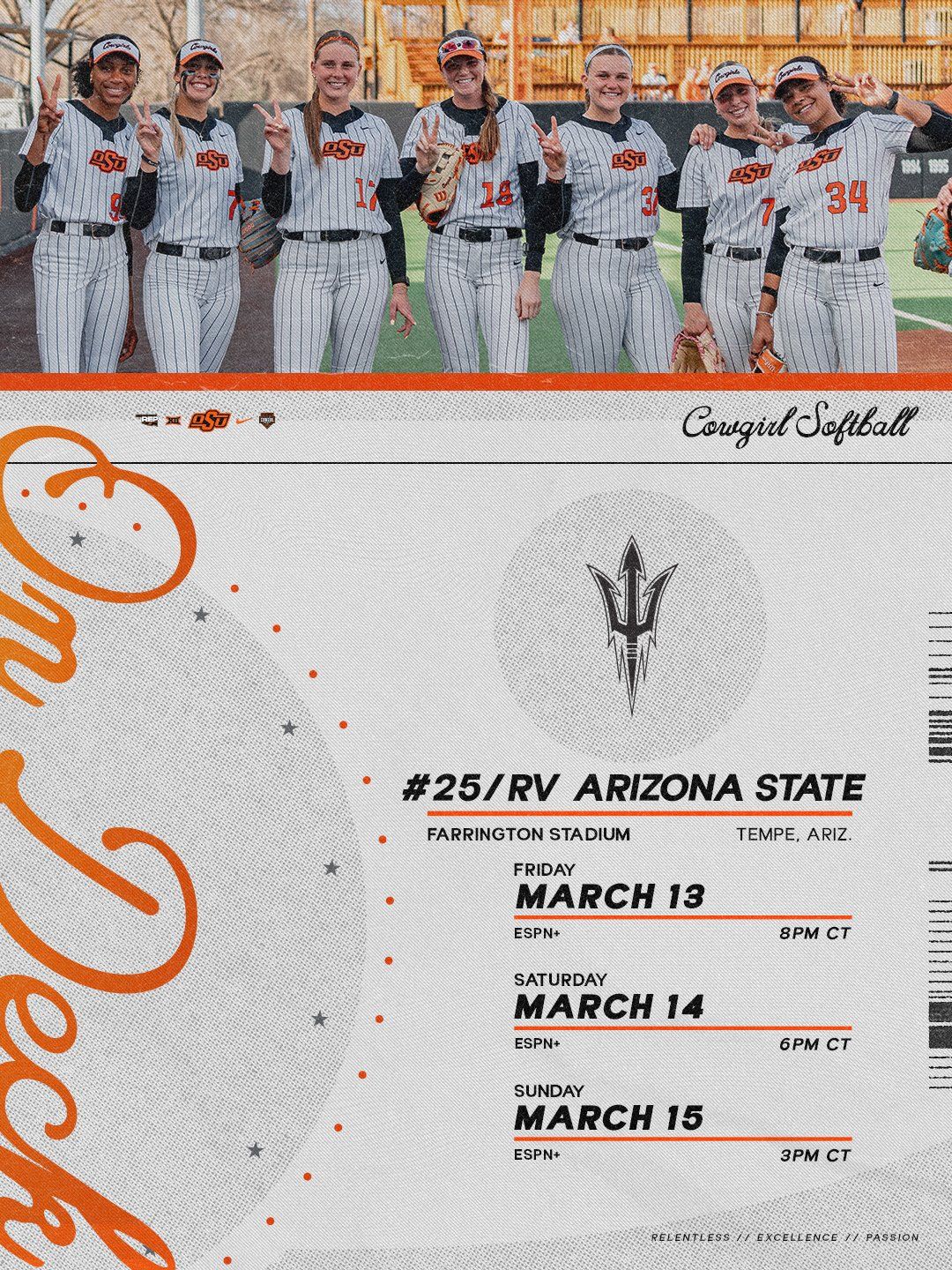 🔼 Desert Dreaming. The 21st-ranked Cowgirl softball team continues Big 12 play on the road this weekend. They’ll play at No. 25 Arizona State, beginning tonight at 8 p.m. All three games will stream on ESPN+.