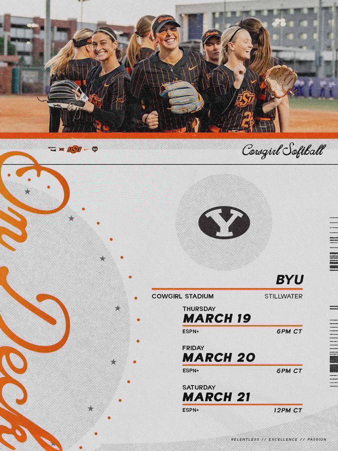 🔼 Quick Turnaround. The 23rd-ranked softball team begins the weekend early as they host BYU! They’ll play tonight at 6 p.m. on ESPN+. The Cowgirls are coming off a road win at GCU.